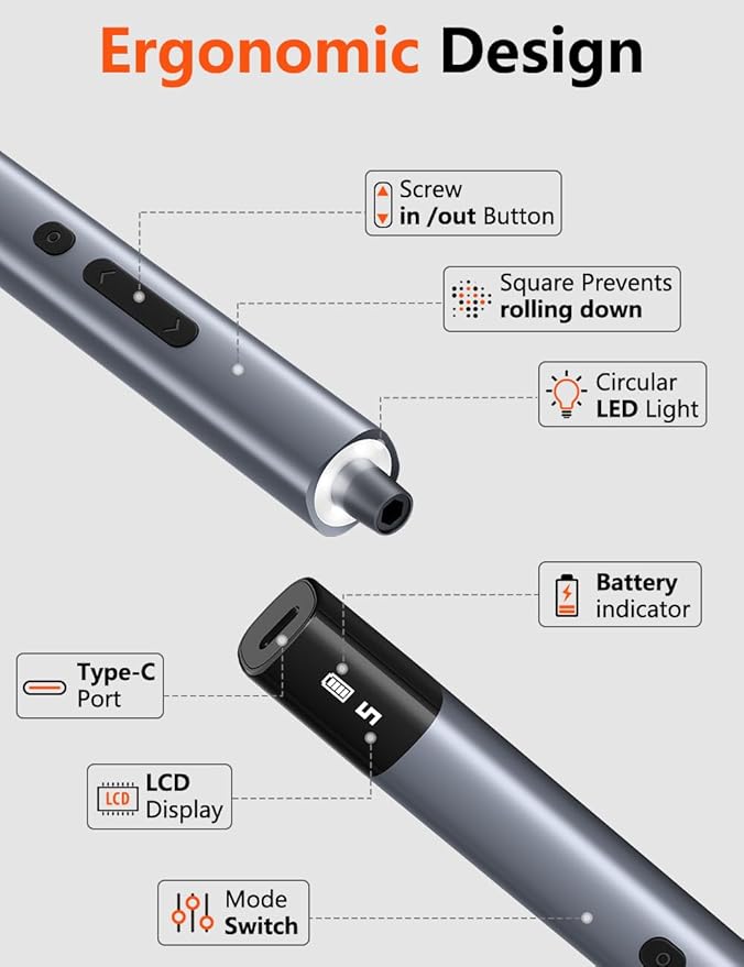 - 【Rechargeable & Long-Lasting Battery】 Powered by a high-capacity 500mAh rechargeable battery, this screwdriver set can handle over 600 screws on a single charge. With a robust 200 RPM motor, even tough jobs become effortless. The USB-C charging cable ensures quick and easy recharging, so you're always ready for your next project.