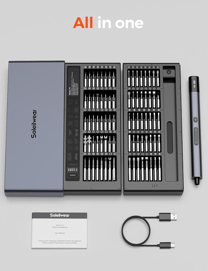 - 【Latest 5 Torque Upgrade & More Powerful】 The Soleilwear mini electric screwdriver features 5 adjustable torque levels** (0.15-0.75N.m), giving you precise control to handle various tasks. The manual torque of 7N.m provides extra power for manual screwdriving when needed.Designed for stability and ease of use, this electric screwdriver cordless is perfect for laptops, smartphones, MacBooks, toys, drones, keyboards, glasses, watches, and most other electronic devices. Save time and effort with a tool built for convenience and efficiency.