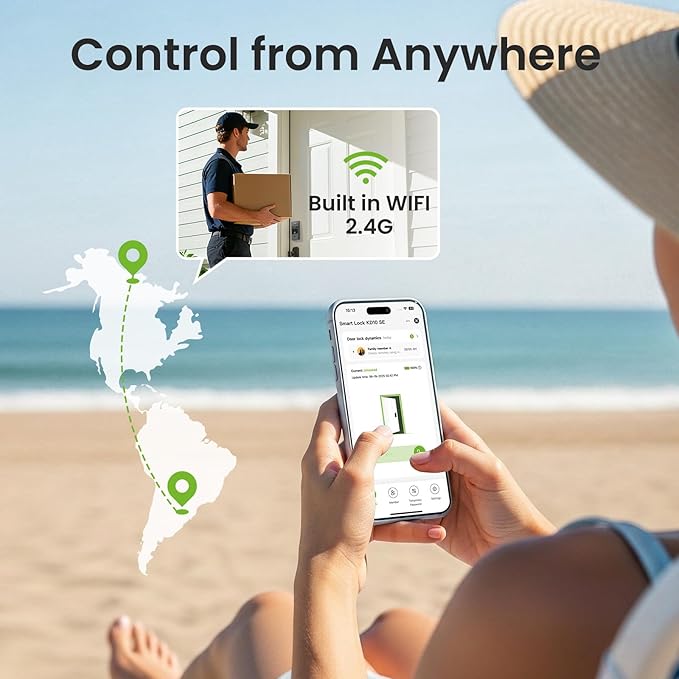 - 【Built-in WiFi & Remote Control (No Gateway Needed)】 Say goodbye to Bluetooth 15m limitations with our built-in WiFi door locks for front door. Unlike traditional smart locks for front door, you can easily Lock/Unlock + Manage Users + Share Permanent or Temporary Codes + View Real-time Access Logs + Receive Low-battery Alerts and Multiple Unlocking Failure Alarm – All via our app from anywhere. Enjoy keyless convenience & peace of mind.