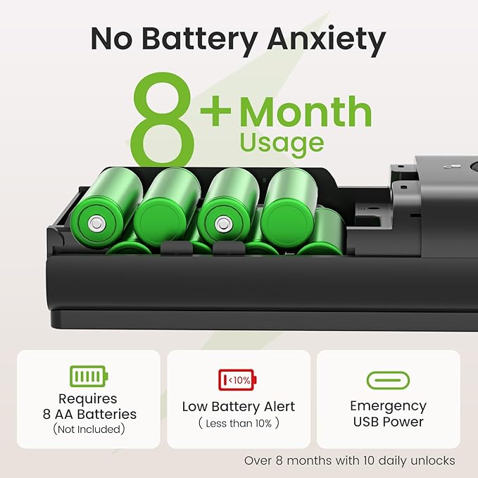 - 【Long-lasting Battery Life & Type-C Backup】 Enjoy long-lasting power with the AA batteries (NOT Included)— get app alerts at 9% battery. Dead batteries? Use any USB-C power bank/charger for instant emergency access – never get locked out!