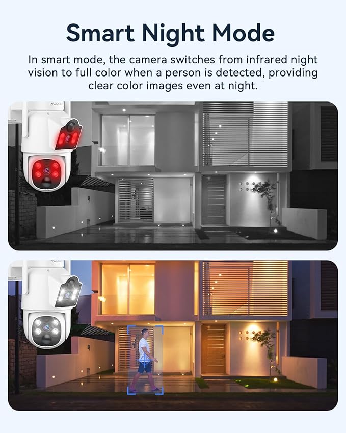 - 4MP+4MP Dual-Lens HD Clarity – All-Day Coverage: Each solar-powered wireless camera features a dual-lens setup with 4MP fixed and 4MP PTZ lenses, delivering sharp 2.5K HD video and flexible viewing angles. With smart night vision settings, the camera can switch to full-color mode only when human motion is detected, and default to infrared otherwise—ensuring clear, efficient monitoring around the clock.