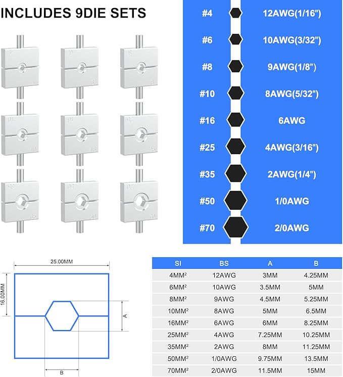 - 9 Interchangeable Hex-Dies: Comes with 9 precision EDM wire-cut dies (12, 10, 8, 6, 4, 2, 1/0, 2/0 AWG & 1/8" for stainless steel rope) for accurate, consistent crimps.