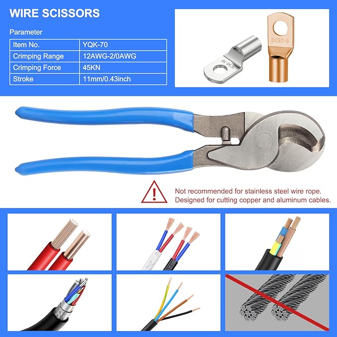 - Sturdy & Reliable – Heat-treated crimping head for strength and durability. Includes cable cutters (for copper and aluminum cables only, not for wire rope). Double-checked before shipping, backed with 18-month after-sales service for peace of mind.