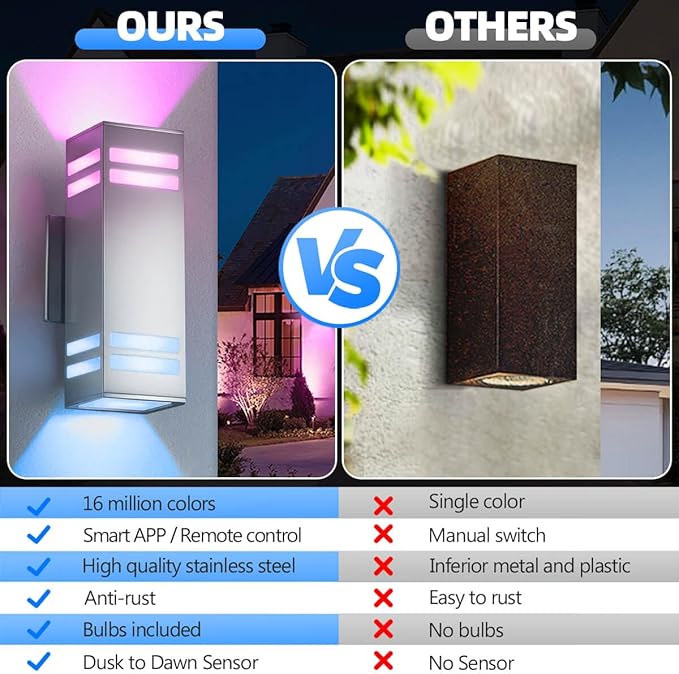 - E26 Base with Included Smart Bulbs - Each light comes with two multi-color smart bulbs that fit standard E26 sockets. Control brightness, color, and schedules via app or remote, easy to install and replace. The up and down light create soft lighting that is both beauty and bright, the symmetrical light pattern offers a polished, contemporary look that adds real curb appeal.
