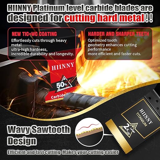 - 【50X Longer Life Carbide Blade】HIINNY Platinum Series Carbide Oscillating Blades,Specifically engineered for cutting heavy-duty metals, Featuring an ultra-hard composite carbide coating, these blades effortlessly cut through bolts, rebar, copper pipes, masonry nails, thick metal plates, screws, hardwood, and embedded nails. Compared to standard bi-metal multi-tool blades, they deliver 50X longer lifespan – the ultimate cutting solution for demanding professionals.