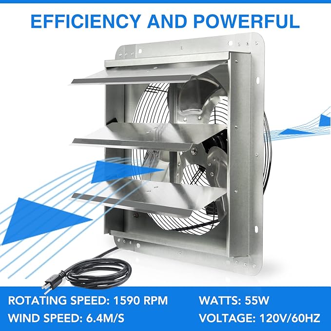 - [Powerful Exhaust Fan]: This 14 inch automatic shutter exhaust fan is powerful with max air flow 1950 CFM, can ventilate your garage, attic, greenhouse or warehouse. This gable vent fan has a regular size and can be applied to more places.