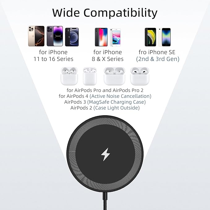 - Made for iPhone & AirPods & Pixel & Galaxy: Compatible with the full iPhone 16e/16/15/14/13/12/11/X/8 Pro Max Mini Plus lineup and AirPods 4 3 2 Pro with wireless charging cases. Also supports Google Pixel 10, Pixel 10 Pro, Pixel 10 Pro XL (Qi2.2 25W Pixelsnap), Pixel 10 Pro Fold (Qi2 15W Pixelsnap), and Samsung Galaxy S25, S25+, S25 Ultra with Qi2 Ready cases for 15W magnetic wireless charging. Auto-align magnetic charging makes every top-up easy and effortless.