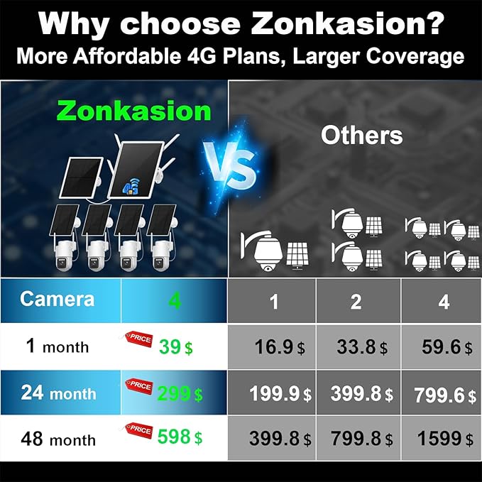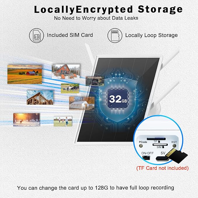 - 【No WiFi? No Worries!】 Works anywhere with 4G LTE coverage—perfect for off-grid or Wi-Fi-free outdoor areas like farms, construction sites, vacation homes, and warehouses. Includes a prepaid SIM card (monthly data plan required). One SIM card supports 4 cameras simultaneously. (For optimal stability and cost savings, we recommend using the built-in SIM card.)