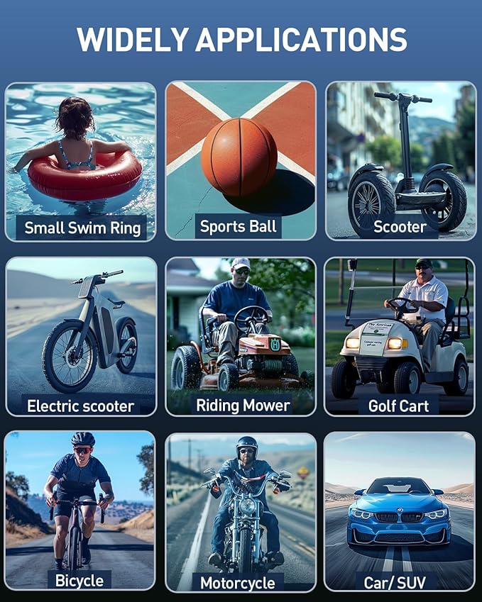 - 【5-in-1 Versatility & One-Touch Operation】Switch between 5 modes for car, bike, motorcycle, ball, and custom inflatables.car tire inflator portable air compressor is a must-have travel accessory —easy to operate and saves time. Whether prepping for a road trip or topping off a bike tire, tire air pump is the ultimate portable tire inflator for car, home, and outdoor use