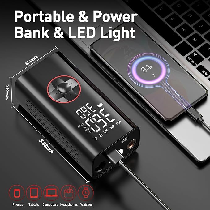 - Mini & Portable Design: Portable air compressor for car tires is compact size strikes the perfect balance between portability and functionality. The air compressor is easy to carry, store in a backpack, mount on a bicycle, or keep in your car, making it ideal for emergencies, outdoor activities