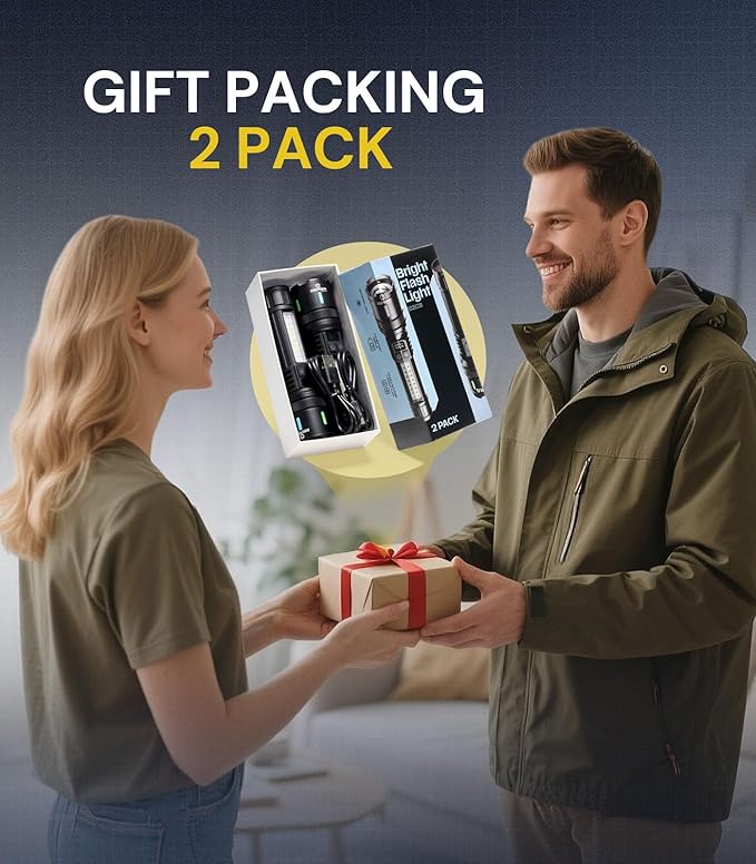 - [PACKING LIST & EXCELLENT CUSTOMER SERVICE] You will get 2pcs flashlight(Built-in 1pcs 6000mAh rechargeable battery), 2pcs USB C cables. We are providing high quality products and the best customer service as our aims. You will be pleasantly surprised by the brightness, quality, longevity and performance of the most powerful flashlight. If you have any questions, please feel free to contact us. We will be happy to answer your questions.