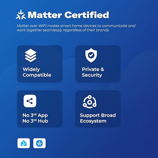 - Effortless Setup & Compact Design: Enjoy effortless setup—just scan the QR code to pair via Matter over Wi-Fi, no hub required. While the compact, safety-certified design ensures a perfect fit in tight spaces without blocking adjacent outlets. Backed by ETL certification and a 1-year warranty for worry-free use.