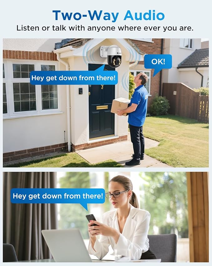 - TWO-WAY AUDIO: Built-in Microphone and Speaker in a security camera system allows to listen and speak through the camera. This feature lets you interact with family, visitors, or deter intruders