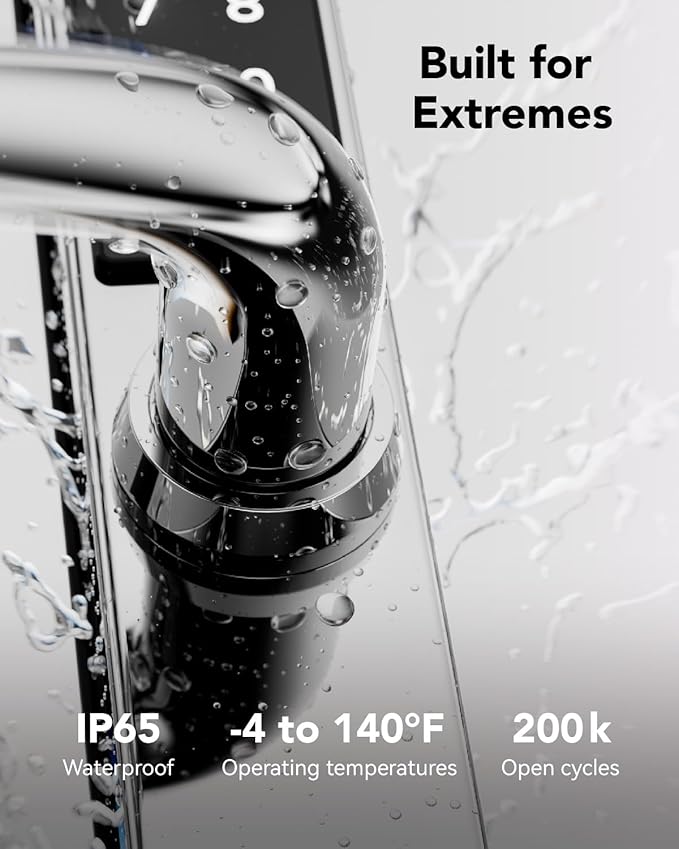 - 🌦️ 【Weatherproof Electronic Door Lock】 Built with stainless steel and rated IP65 waterproof and dustproof, this electronic door lock resists rain, dust, and extreme temperatures (-4°F to 140°F). Powered by 4 AAA batteries for up to 6+ months of use, with low-battery alerts, Type-C emergency charging, and mechanical keys as backup. A durable front door lock for year-round security.