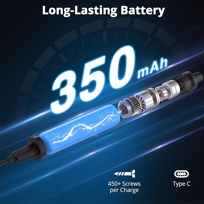 - 【Long-Lasting Battery, High Efficiency】Equipped with a 350mAh rechargeable battery and tested to tighten over 450 M2.5×5mm screws on a single charge, this tool keeps up with demanding repair sessions. With a stable 180 RPM speed, it gets the job done smoothly while reducing hand fatigue. The USB-C port allows for fast and convenient charging anywhere.