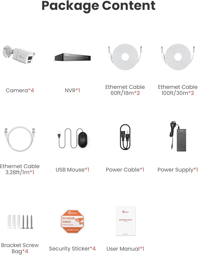- Easy to Install & All Round Coverage: The PoE camera can plug & play just via a network cable. Equipped with two 100ft cables and two 60ft cables for four cameras, installation is flexible and simple. Linked to NVR and router, enjoying Camstro's secure surveillance effortlessly.
