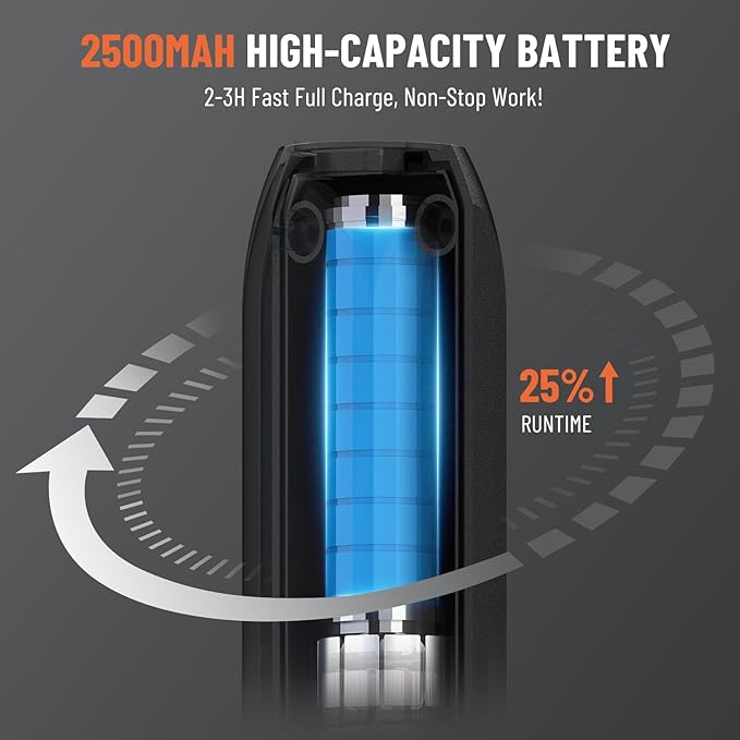 - Extended Runtime & Smart Power Display: This 3.7V power rotary tool packs a 2500mAh high-capacity battery (25% longer runtime than others) with an innovative 4-LED power bar that displays real-time battery levels. Stay informed and work uninterrupted (Type-C charging—recharge when 1 light remains).
