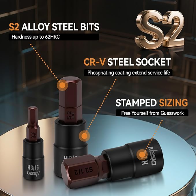 - 【Premium Material】DISEN 32PC Hex Bit Socket Set are made of premium heat treated Chrome Vanadium Steel with a black phosphate finish on torx socket end and heat treated S2 Alloy Steel on hex bits, a high quality material with high durability and maximum strength, and provide greater torque. Chrome plated on the surface for anti-corrosion and rust prevention
