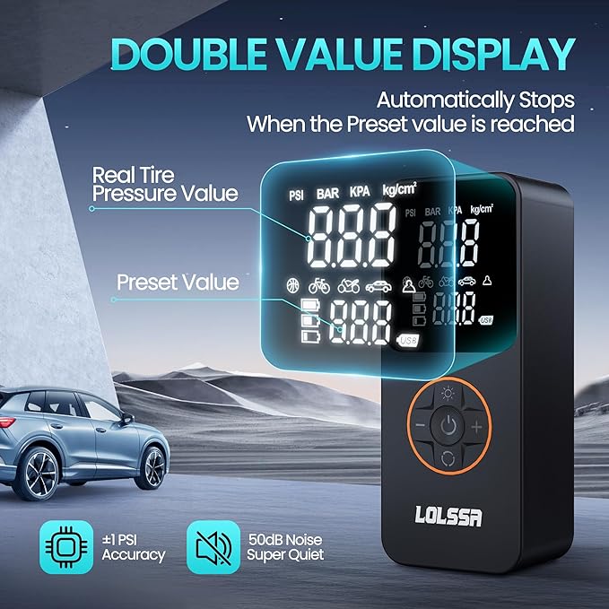 - Tire Inflator: Clear screen with tire pressure gauge feature. Dual values for easy read pressure preset value and real-time pressure value, measurement accuracy ±1 PSI for safer inflation. 3 kinds of lights, LED, SOS, flashing lights, for the dark night and emergency situations , Add security to your journey