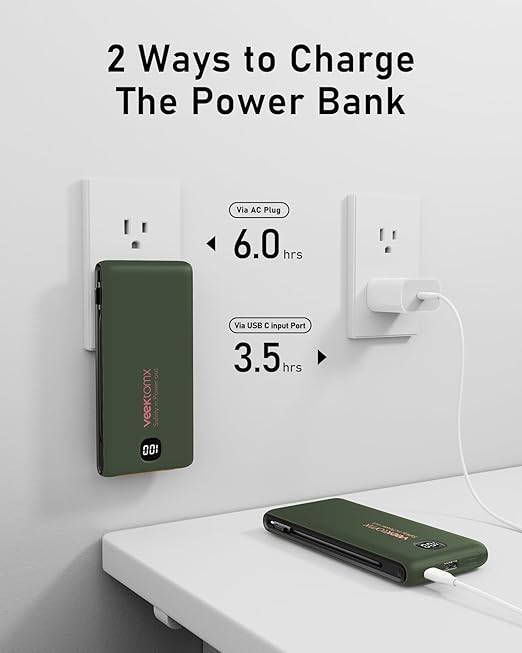 - [AC Wall Plug Power Bank] This portable charger built in AC Wall plug, compatible with iPhone, Android, and USB C devices. The built-in AC Wall plug allows you to recharge directly from the wall outlet. No need to carry charging cables for your smart devices anymore, travel charger for multiple devices, and your best travel accessories for your smart devices
