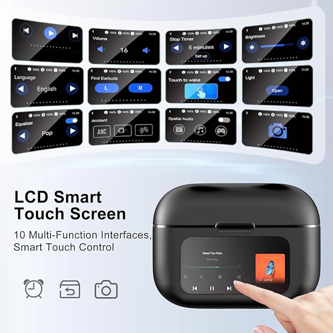 - LED Touch Display: The clip on ear buds wireless bluetooth earbuds feature a highly sensitive, full-color intelligent LED touch display. The smart touch charging case not only allows precise control of music playback, track switching, and volume adjustment, but also features more than a dozen multi-function interfaces, such as alarm clock, photo taking, headphone search, and lock screen wallpaper, ensuring a personalized listening experience. The aesthetics and minimalist design make clip on wireless earbuds a fashionable statement for a tech-savvy urban lifestyle