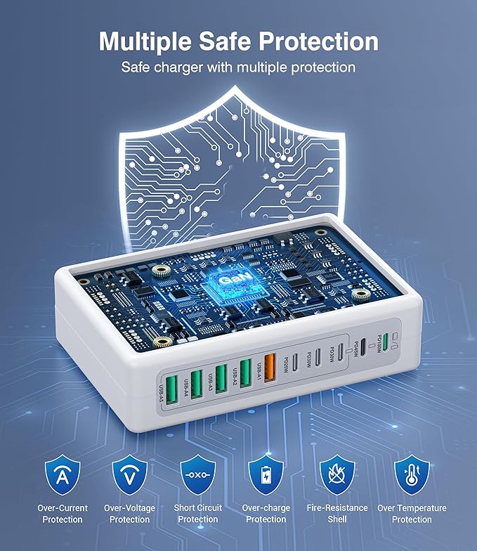 - 【Safe and Efficient Fast Charging】: As professional c chargers fast charging equipment, this super fast charger usb c is built with multiple protection measures and intelligent IC identification technology to prevent short circuit, overcurrent, overvoltage, overtemperature and overcharge. It automatically stops charging when fully charged, ensuring device safety and long life. Trust this charging station for multiple devices to deliver efficient power without compromising on safety