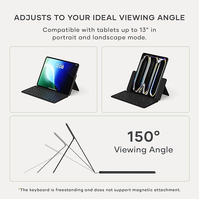 - Adjustable Stand & Portable Keyboard – Work comfortably anywhere with the integrated adjustable stand, offering multiple viewing angles from 30° to 150°, and supporting tablets and smartphones up to 13” in both portrait and landscape modes. The Satechi foldable keyboard fits easily into any bag or backpack, making it the perfect travel companion for digital nomads, students, hybrid workers, and multi-device users who value comfort and portability (L: 28.74 cm / 11.31 in; W: 14.94 cm / 5.88 in; H: 1.27 cm / 0.5 in)