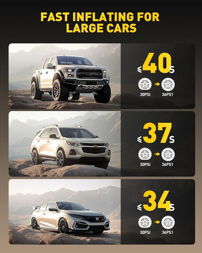 - 【40S FAST INFLATION】 Compared to others’ 14mm single air cylinder, AUXITO car tire air pump portable equipped with upgraded 19mm double air cylinder and 100w powerful motor which can produce 40L/MIN airflow, pump up a standard car tire from 0psi to 36psi in just 5 minutes, 40s to add air from 28psi to 36psi. Saving you valuable time when you're on the go, no more waiting around at gas stations
