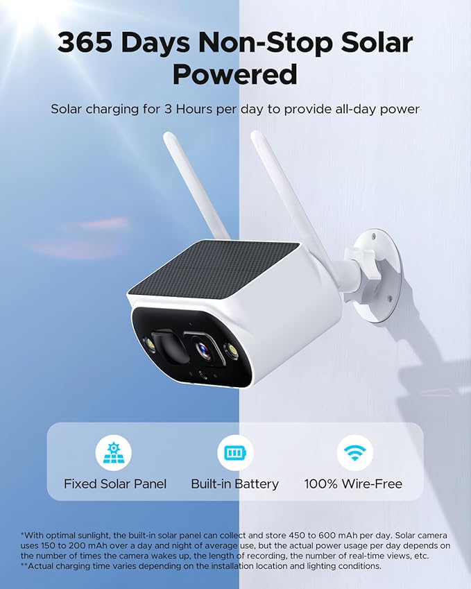 - Solar Charging with Built-in Battery: Each solar camera outdoor wireless unit has an upgraded solar panel (95% efficiency) and 8000mAh battery for nonstop use—place it anywhere with sunlight, no wiring or power outlets needed.