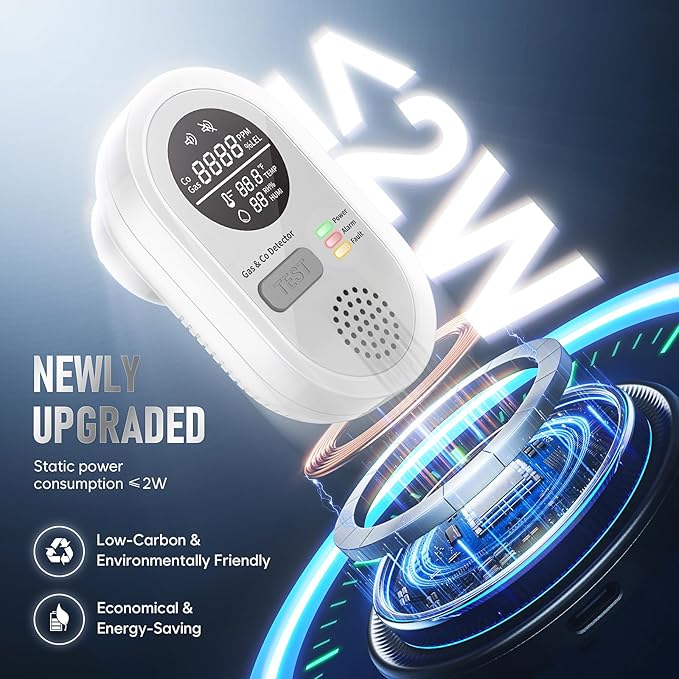 - 【8-in-1 Plug-in Carbon Monoxide Detector】This multi-functional carbon monoxide detector integrates carbon monoxide concentration (PPM), natural gas concentration (%LEL), temperature (°F), and humidity (RH%). With its powerful performance, dual sensors, dual alarm system, and rapid response, the 8 multi-functional features provide comprehensive protection to ensure home safety.