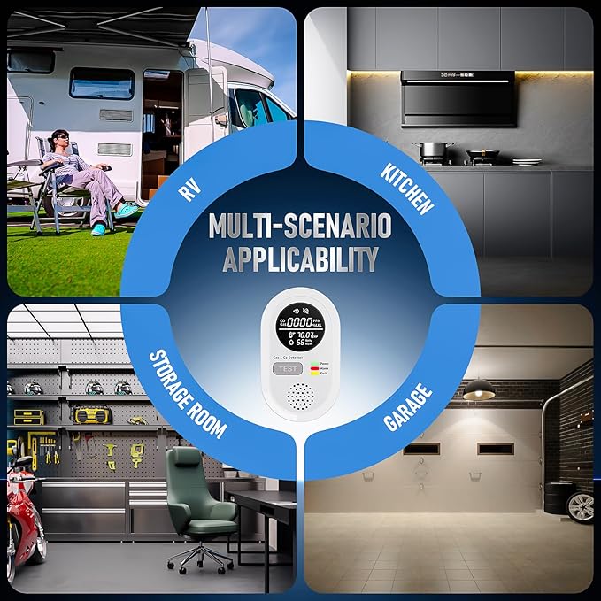 - 【High-Precision Monitoring】The upgraded carbon monoxide detector features a large LCD screen that displays real-time data, allowing you to assess indoor air quality instantly. It monitors carbon monoxide peaks (0-1000 PPM), gas levels (0-10% LEL), humidity levels, and ensures comfortable temperatures. Suitable for various scenarios such as homes, hotels, RVs, and cruise ships.