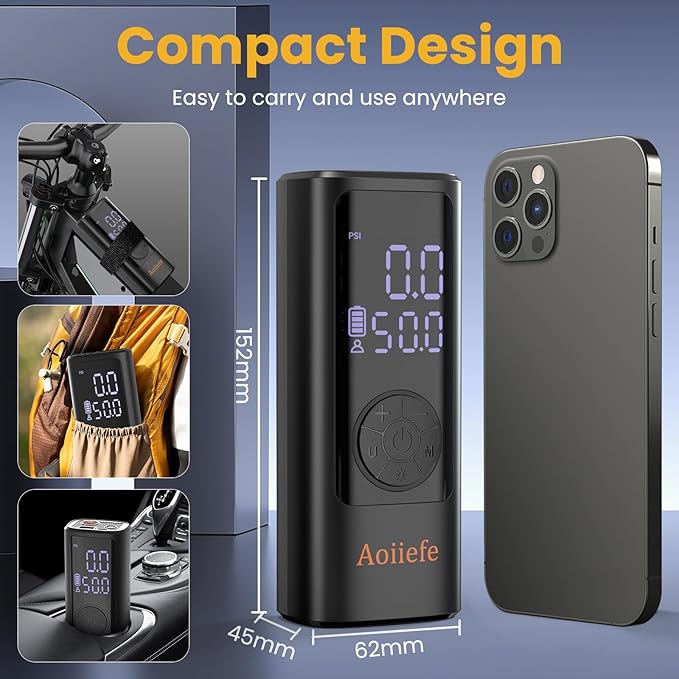 - Fast & Cordless Inflation – This portable tire inflator delivers rapid air compression for car tires, bikes, and sports equipment. No cords needed—powered by a rechargeable lithium battery with type-C.
