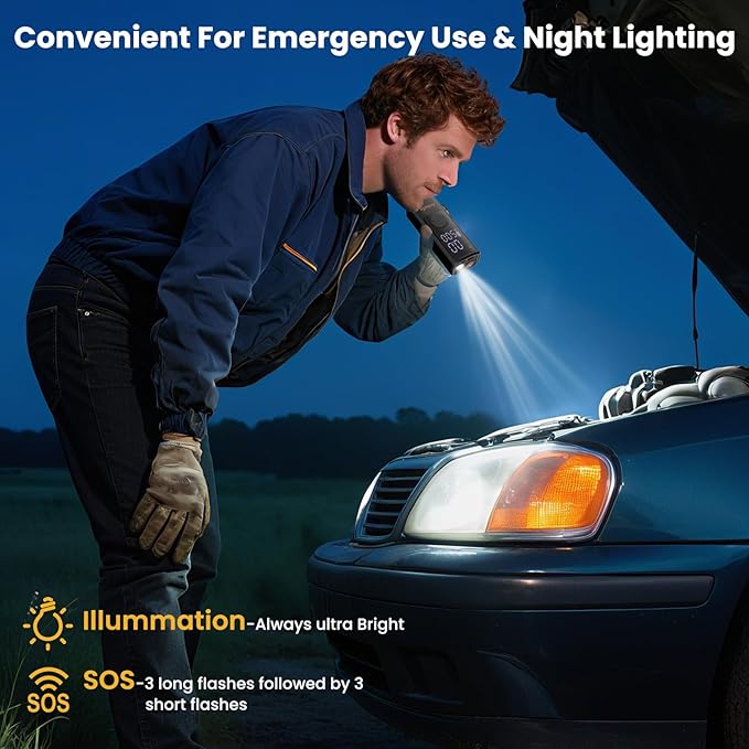 - Dual LED Lights for Emergencies – Equipped with a bright LED work light for nighttime repairs and an emergency flashlight with strobe modes, making it ideal for roadside emergencies and outdoor adventures.