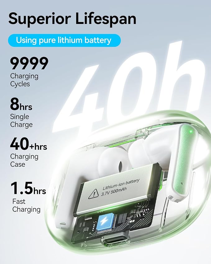 - Dual LED Display, 40H Long Playtime: Keep the tunes flowing for an incredible 8 hours per charge, plus 32 additional hours from the sleek charging case. A mere 10-minute charge injects 1.5 hours of audio bliss into your day, ensuring your soundtrack continues with barely a pause.