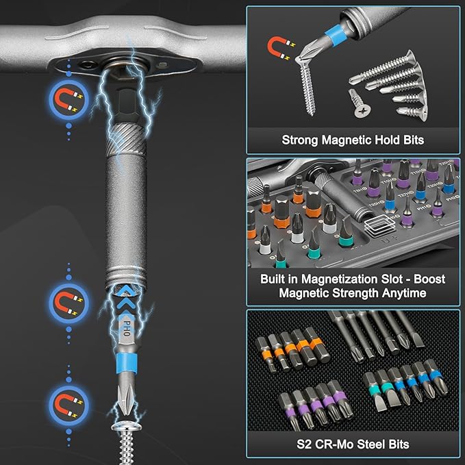 - Powerful Magnetic Attraction: This DIY magnetic screwdriver set features a fully magnetic design, with a magnetic handle and built-in slots to securely hold the screwdriver bits, which can be easily recharged with magnetic energy to prevent slippage. Each bit is magnetized to enhance precision, improving work efficiency