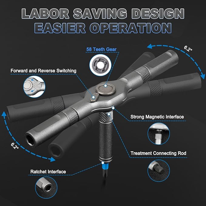 - Effort Saving Ratchet Screwdriver: This 42 in 1 ratchet screwdriver set features a 58-tooth reversible ratchet mechanism and a 6.2-degree effort-saving design, reducing the effort required to tighten or loosen screws by 80%. It is ideal for tasks such as furniture assembly and appliance repairs, eliminating the need for wrist adjustments