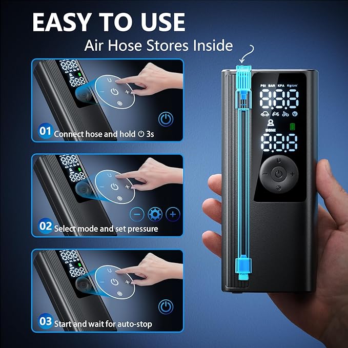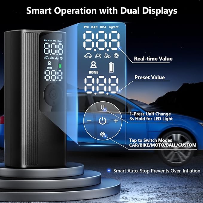- Auto Stop & Easy to Use: Just set your desired pressure and walk away – the air pump will stop on its own when it reaches that value, preventing over-inflation. The auto shut-off feature is safe and reliable, and you don’t have to watch it—it works all by itself. This portable air compressor makes filling tires simple and worry-free, featuring two digital screens that clearly display both current and target pressure, along with intuitive buttons for easy operation even for beginners.