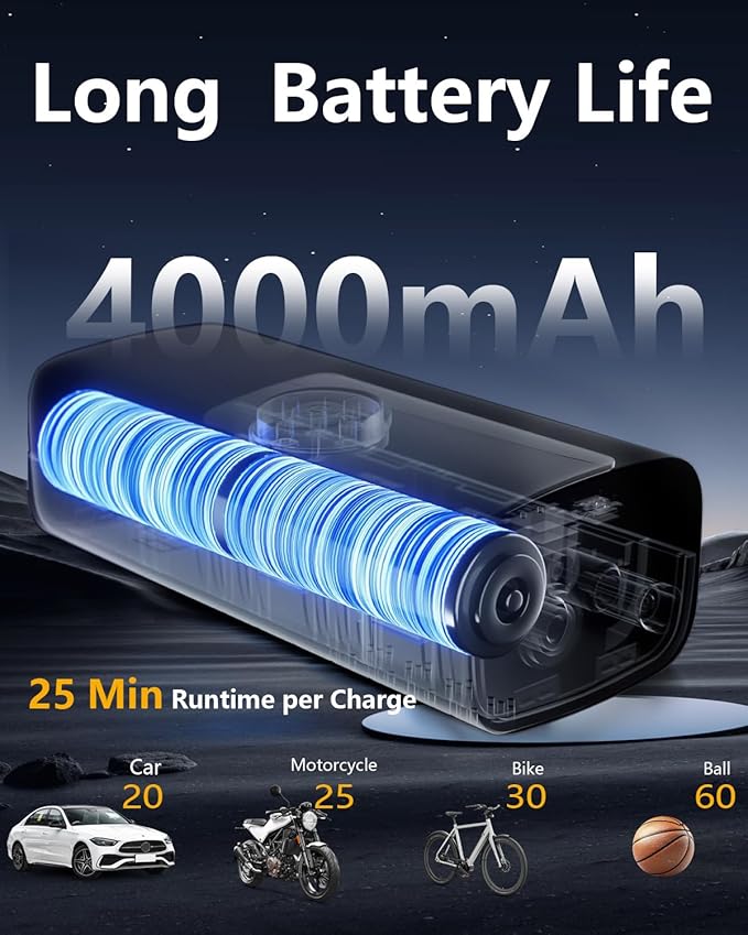 - Protable & Cordless Design: This wireless car tire inflator is small (16x7x5cm) and light (500g), so you can take it anywhere easily, such as in your car glove box, bike bag or backpack. It’s always ready for emergencies or just filling up tires. It has a built-in battery that you can recharge with the included Type-C cable. Once charged, it can run without a cord for up to 25 minutes. That means you can fill about 2 car tires, 25 bike tires, or 60 sport balls with one charge.