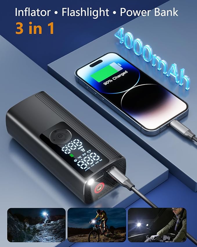 - 3X Faster Tire Inflator: This portable tire inflator works very well and can handle even tough jobs with up to 150 PSI of power. With a powerful 32L/min airflow, it refills a car tire (30–36 PSI) in just 1 minute—three times faster than most basic pumps. With its highly accurate sensor, this pump fills your car, motorcycle, or bicycle tires perfectly and safely. No more slow or unreliable pumps—the tire pump works quickly and correctly anywhere.