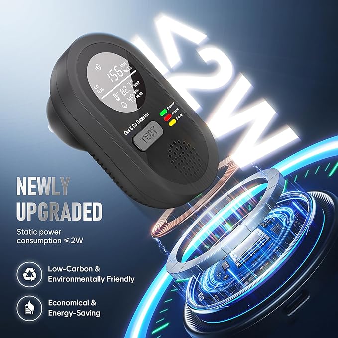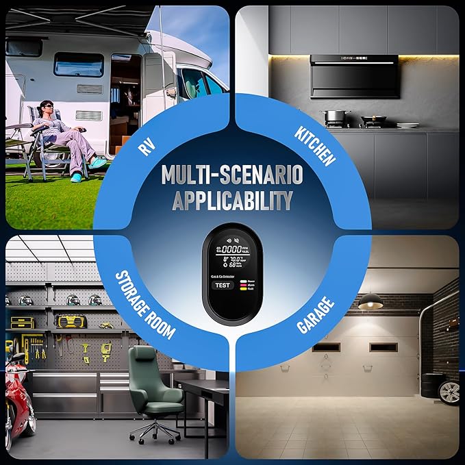 - 【High-Precision Monitoring】The upgraded carbon monoxide detector features a large LCD screen that displays real-time data, allowing you to assess indoor air quality instantly. It monitors carbon monoxide peaks (0-1000 PPM), gas levels (0-10% LEL), humidity levels, and ensures comfortable temperatures. Suitable for various scenarios such as homes, hotels, RVs.