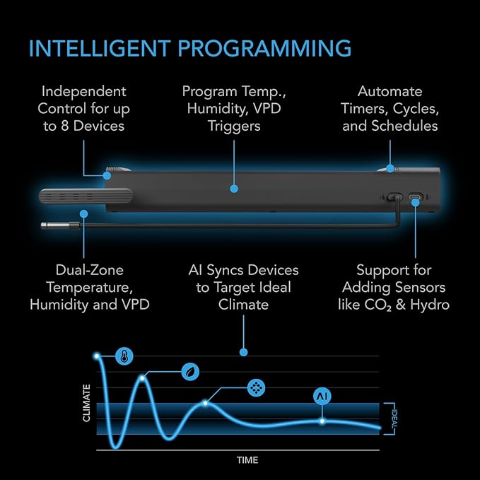 - Independent smart outlets with AI climate targeting to create the ideal environment in grow spaces, aquariums, terrariums, home HVAC, and more.