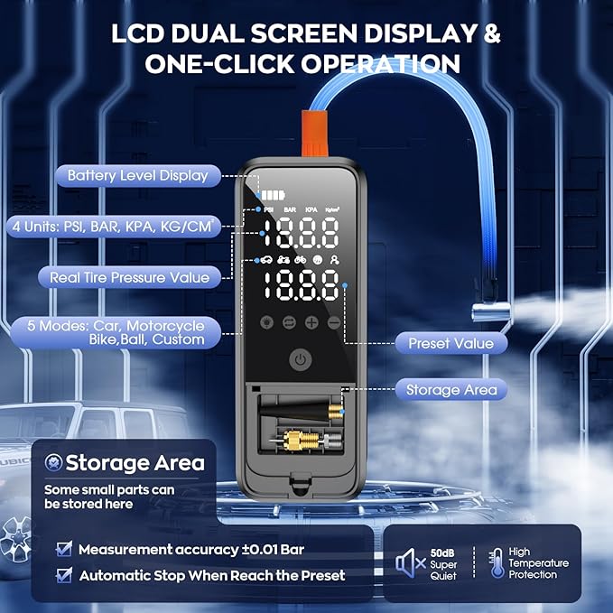 - 【5 Intelligent Modes & 4 Pressure Units】 This portable tire inflator supports 5 preset modes (Car, Motorcycle, Bike, Ball, and Custom). Easily switch between 4 pressure units (PSI, BAR, KPA, KG/CM²) with a long press, making it perfect for inflation needs during long trips or everyday family use. NOTE: This portable air compressor is not suitable for high-volume inflation tasks such as air mattresses, paddleboards, or heavy-duty tires.
