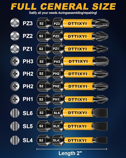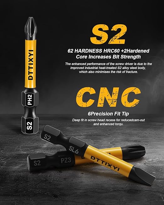 - [Engineered Toughness] Built from premium S2 alloy steel with heat-treated hardening. CNC-milled tips grip screws tightly and maintain strength under impact driving at 58–62 HRC.