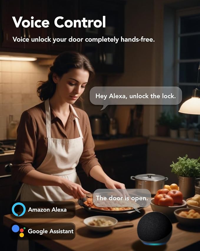 - 👆6-in-1 Keyless Entry:Unlock your deadbolt smart lock via 6 ways: fingerprint, APP, IC card, passcode, physical key, and voice control through Alexa/Google Assistant. With a 99% fingerprint recognition accuracy, it can store up to 100 unique fingerprints. This versatile digital door lock offers personalized access options for kids and the elderly, combining flexibility and convenience.