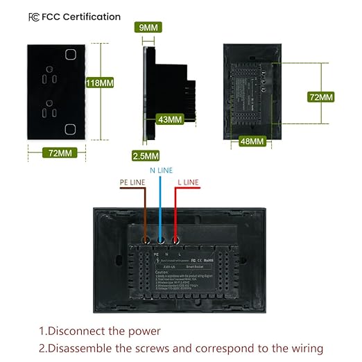 - 【Note】: The product size is 118*72*43 mm. No additional gateway is required. Only 2.4GHz Wi-Fi connection is supported (5G WiFi is not supported).Fire-proof material, tempered glass panels are easy to clean. The box contains instructions, screws and a WiFi socket
