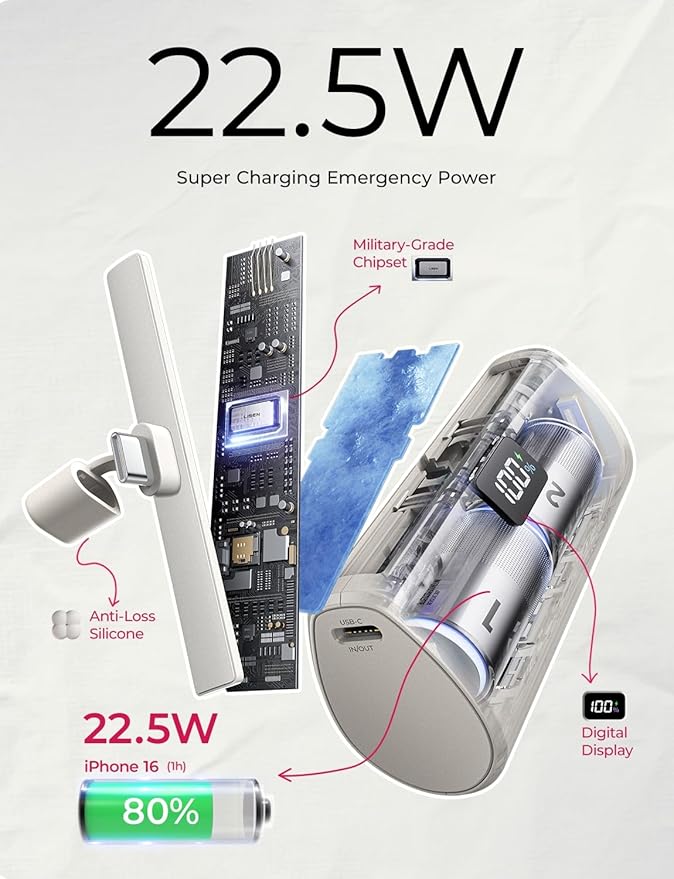 - 【22.5W Super-Fast Charging】Get a 50% charge for your iPhone 16 in just 30 minutes. The advanced 22.5W output of this mini portable charger delivers high-speed power, quickly providing hours of use for your devices during busy days on the move.