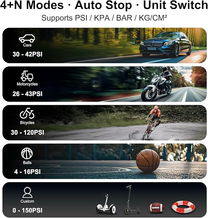- 【4+N Smart Modes with Dual Display】 Dual screen shows both preset and real-time pressure readings at a glance. Choose from 4 preset modes (bike/motorcycle/car/ball) with auto shut-off, or customize 0-150PSI for any inflatable. Easily switch between PSI, KPA, BAR, and KG/CM² units with one button.