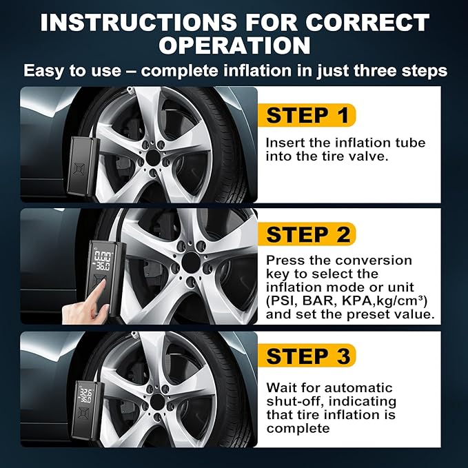 - VERSATILE & READY FOR ANYTHING:More than a tire inflator, it’s your all-in-one inflation kit. Includes four nozzles for cars, bikes, balls, pools, and more. Plus, the built-in LED light features three modes—light, strobe, and SOS—for emergencies and night use. Reliable, adaptable, and essential for every household and adventure.