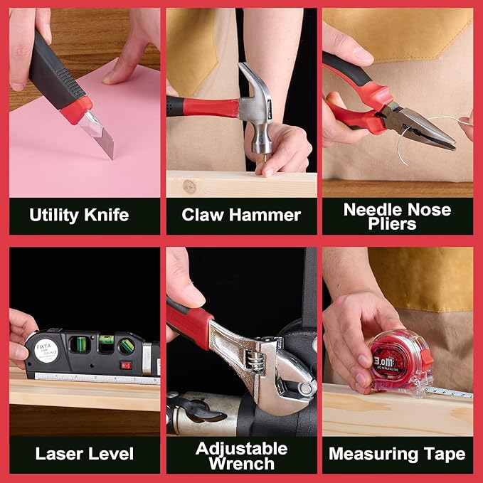 - 【142-Piece household tool kit】9 *Socket Wrench; 1 *Socket Screwdriver;1 *Utility Knife;10 *50mm Screwdriver Bits;30 *25mm Screwdriver Bits;8 *Hex Key Screwdriver;5 *Utility Knife Blade;2 *2.5mm Flat Screwdriver;2 *2.5mm Cross Screwdriver;3 *Masonry Drill Bits;3 *Wood Drill Bits;1 *3 Meter Measuring Tapes;1 *6 inch Needle Nose Pliers;1 *Claw Hammer;1 *8 inch Adjustable Wrench;60 *Expansion Screws;1 *Plastic Box;1 *12V Cordless Drill;1 *Battery;1 *Fast Recharger