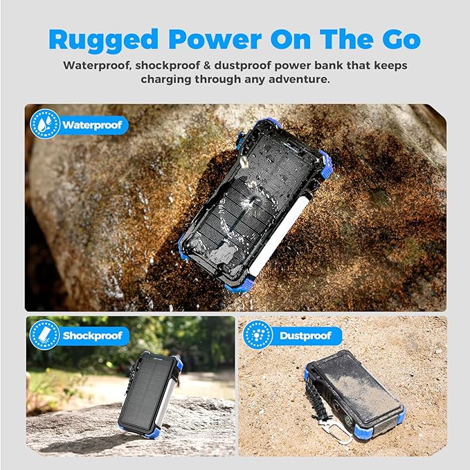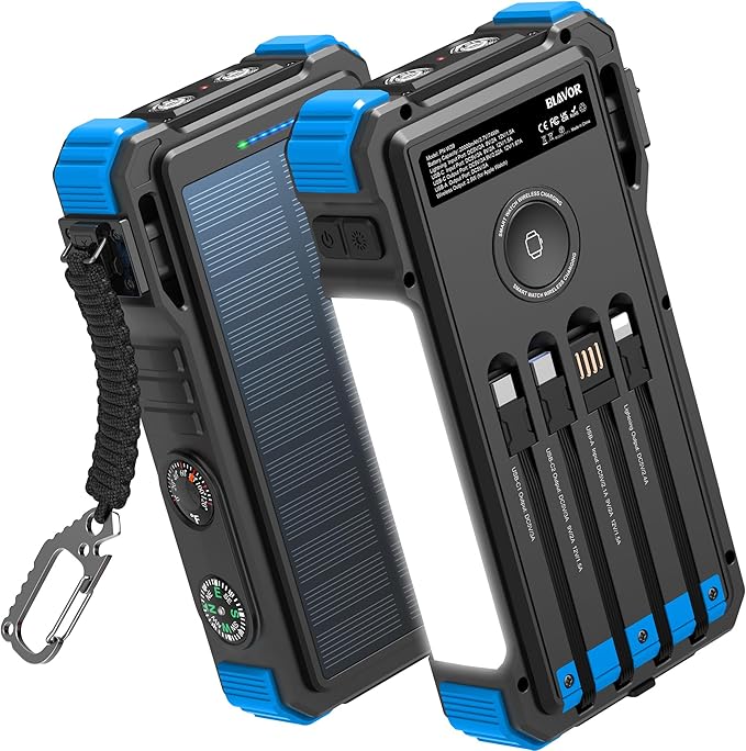 - Durable And Adventure-Ready: Built to withstand anything nature throws at it, the BLAVOR solar charger power bank is a true warrior. Its flame retardant ABS+PC shell and waterproof silicone protection make it waterproof, shockproof, and dustproof, ensuring it can handle extreme conditions with ease. No matter where your adventures take you, this charger is up for the challenge